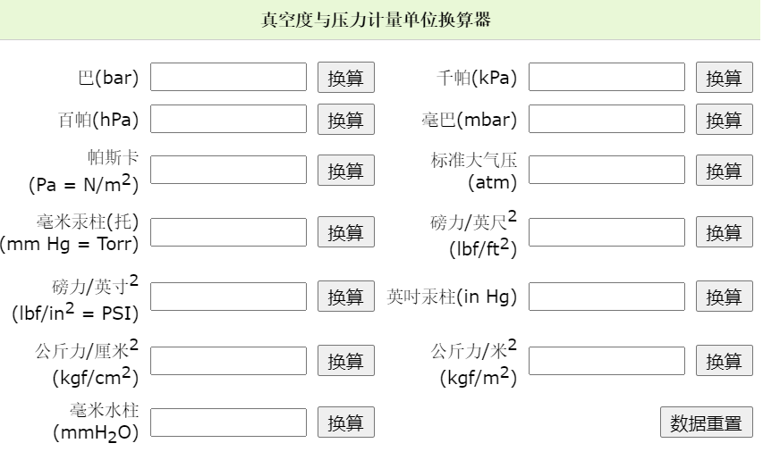 真空度与压力单位自动换算器(实用免费工具)